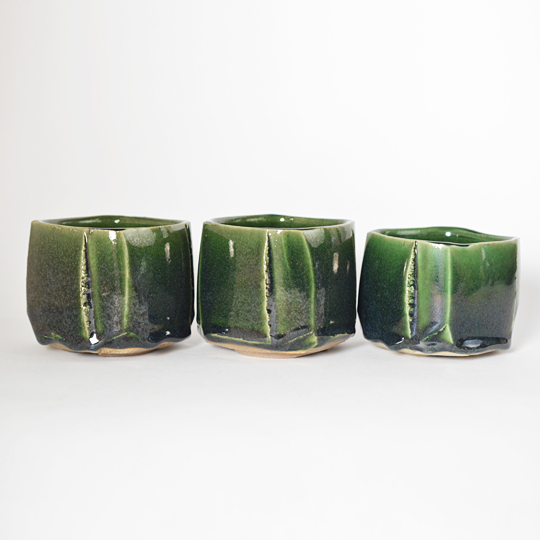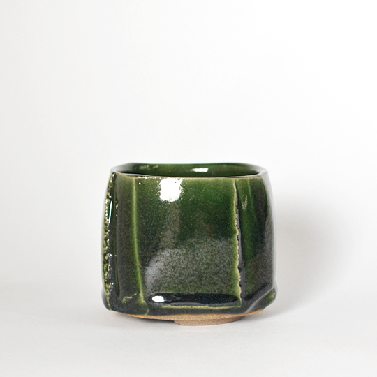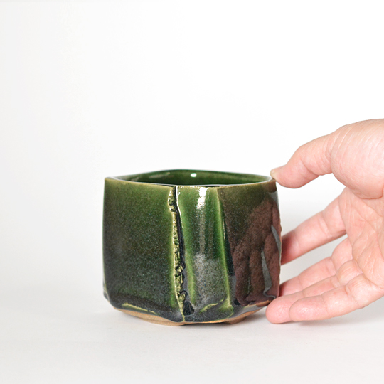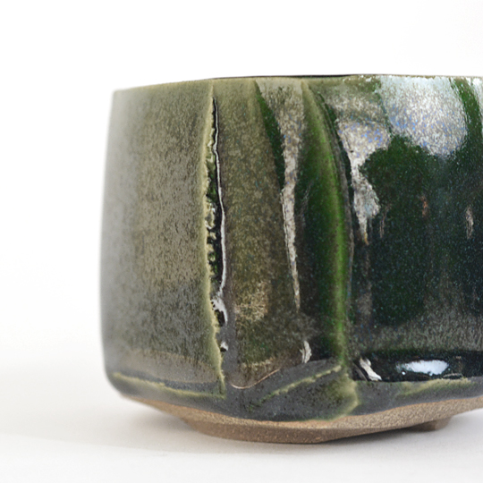 こちらの鉢は織部焼きを再現しており、茶碗形状の中にエッジを取り入れ、濃いグリーンの釉薬に濃淡をつけています。