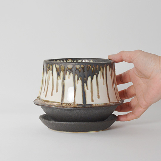 下部はざらっとした渋い色合いの釉薬、上部は白く艶のある釉薬の上から金彩が流れ落ちるように施されており、コーデックスや多肉植物と相性が良さそうな植木鉢。