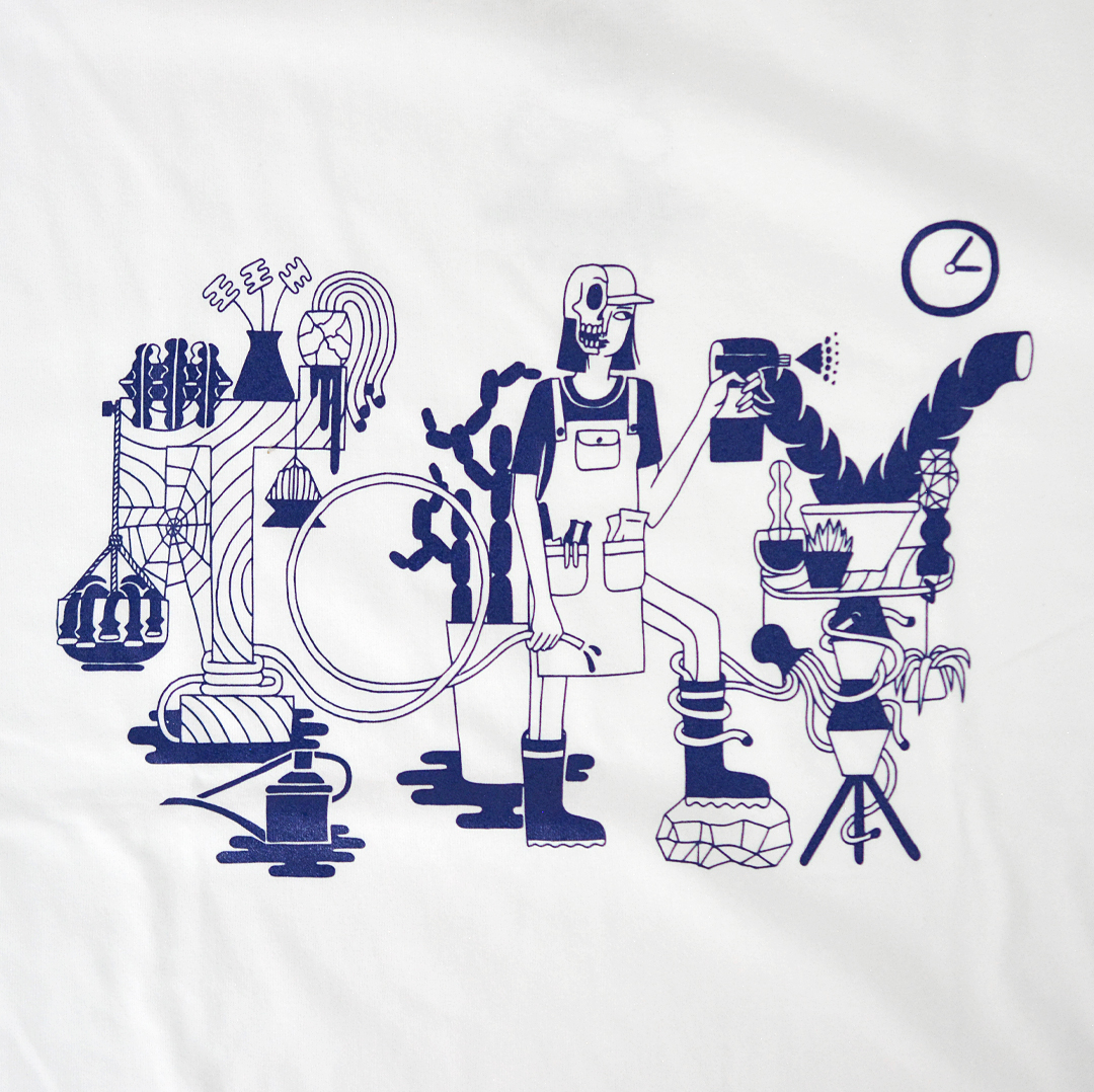 バックプリントは首もとに入れられています。不思議な造形の植木鉢から植物の神様?のような存在が顔を出しており、これからの園芸の未来が明るいことを示唆しています。
